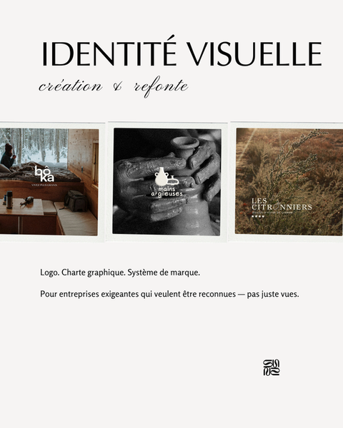 Je conçois des identités visuelles complètes : logo, charte graphique, typographies, palette chromatique, système de marque déclinable sur tous les supports. Chaque élément est pensé en cohérence, chaque choix graphique est motivé par une intention stratégique — jamais par une tendance passagère.